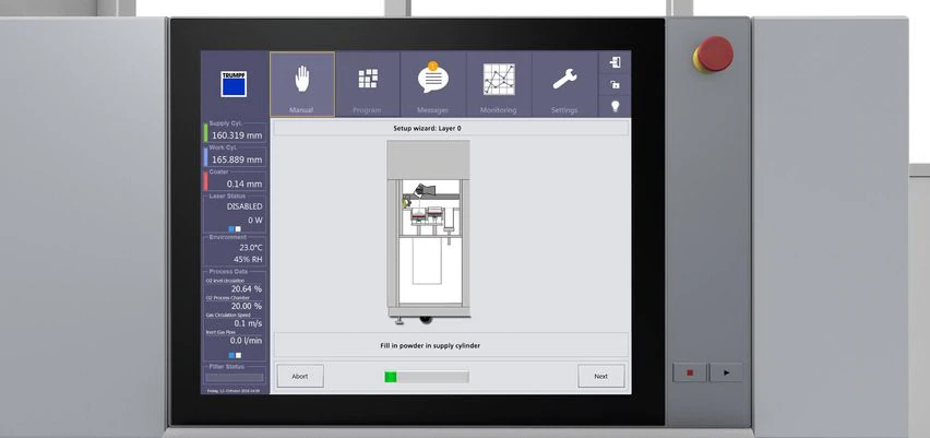 安裝向?qū)箼C(jī)床操作輕而易舉!機(jī)床操作人員可直接通過機(jī)床人機(jī)界面調(diào)用 TruPrint 安裝向?qū)?。隨后,操作人員可以在向?qū)е兄鸩酵瓿筛鱾€(gè)工步,例如零層磨合。
