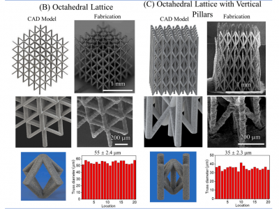 利用 Aerosol Jet 3D 納米顆粒成型技術(shù),制造新型高度復(fù)雜的3D 金屬微晶格材料,其具有: 直徑30–60μm,單位尺寸100 – 400μm 的近固態(tài)桁架構(gòu)件;設(shè)計了 3 種密度為大塊金屬 5% 至 26% 的晶格結(jié)構(gòu),以在壓縮載荷下通過彎曲和屈曲為主的機(jī)制變形
