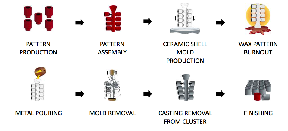 獲取三維數(shù)據(jù)(或三維掃描)——3D打印蠟?zāi)#ā止ぶ颇#N蠟樹——石膏制?!喑檎婵铡姹菏唷劢饾茶T——剝離石膏?!獩_洗、酸洗、清洗(——稱重)——修毛坯,拋光等后處理——產(chǎn)品——檢測